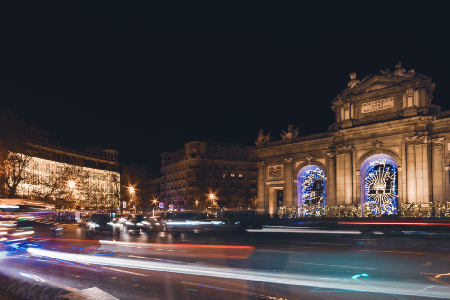 Nuestro recorrido comienza en la Puerta de Alcalá, uno de los iconos más elegantes de la ciudad, desde donde bajamos hacia Plaza de Cibeles. Aquí, la vista del Palacio de Cibeles iluminado y la Calle de Alcalá es simplemente imprescindible, especialmente al caer la noche.